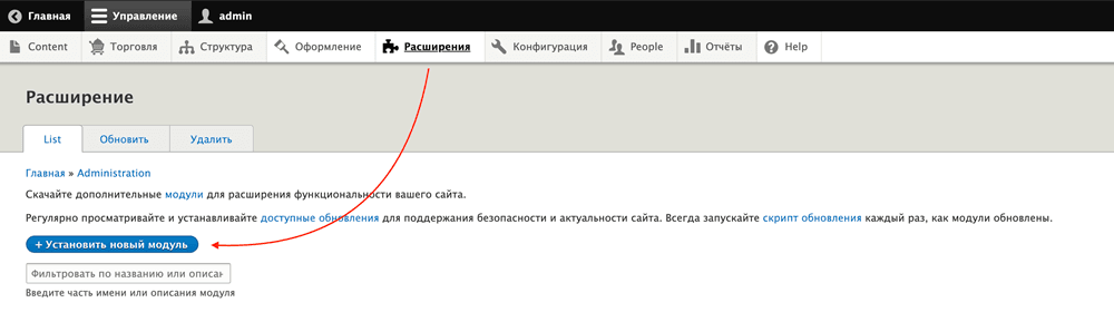 - Войдите на свой сайт как администратор и выберите Модули > Управление модулями. Отобразится следующая страница.