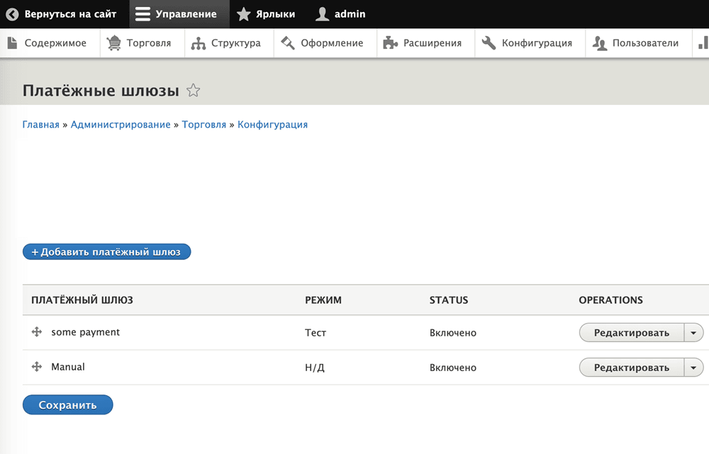 - Войдите на свой сайт как администратор и выберите Администрирование > Способы оплаты.