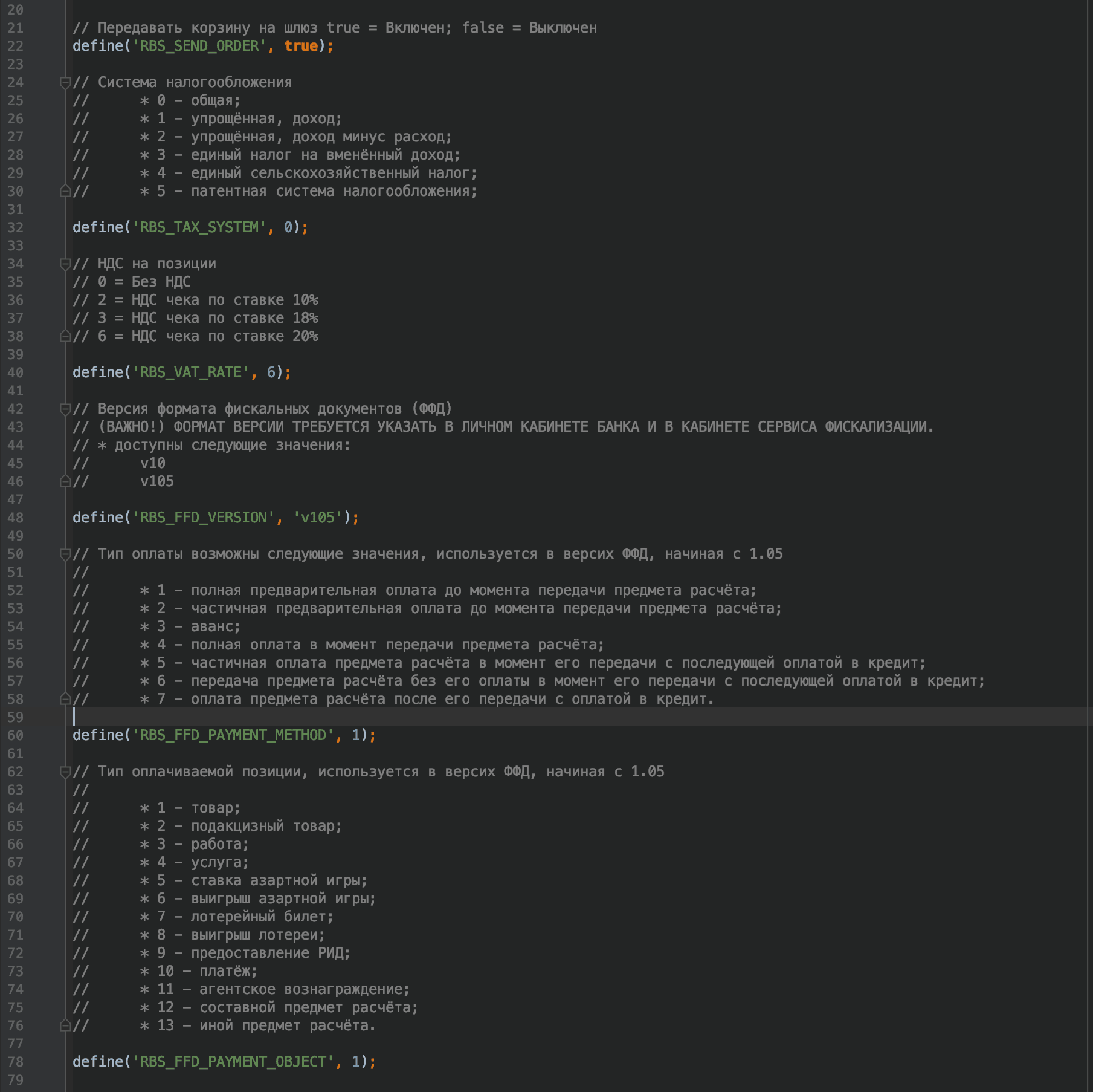 Выше перечислены основные параметры. Приведенные ниже дополнительные параметры относятся к налогообложению и корзине покупок и могут быть проигнорированы, если для RBS_SEND_ORDER установлено значение false (рекомендуемое значение по умолчанию). При необходимости обратитесь в службу технической поддержки по поводу значений этих параметров.